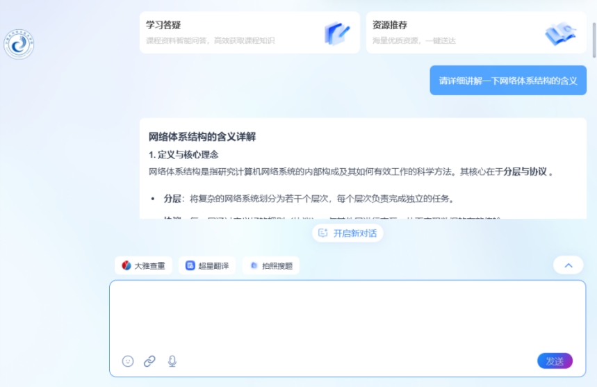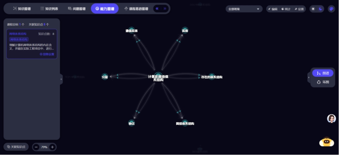 课程团队基于超星泛雅平台,集成DeepSeek-化大小计等大模型能力,打造《计算机网络》智慧课程平台,建立97个知识点、14个知识点资源、1260个教学资源、54个拓展资源,形成知识图谱、能力图谱、课程思政图谱等相关数字资源,为智慧课程建设打下良好的基础。学生可通过自然语言提问,AI助手即时生成可视化解析,学生学习的效率得到大幅度提升。